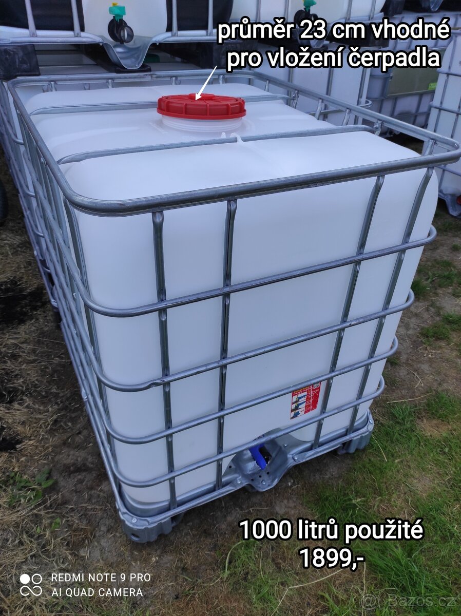 Prodám ibc kontejner o objemu 1000 litrů s velkým vrchním víkem cca 23 cm vhodné pro vložení čerpadla. Ibc je od zahradního hnojiva. Ocelová paleta. Vymytá tlakovou vodou. Možné vypouštěcí příslušenství, filtr hrubých nečistot, palety pro vyvýšení nebo vzájemné propojení nádrží mezi sebou. Nezávadná. Možnost dovozu 10,-/km (počítá se i cesta zpět)