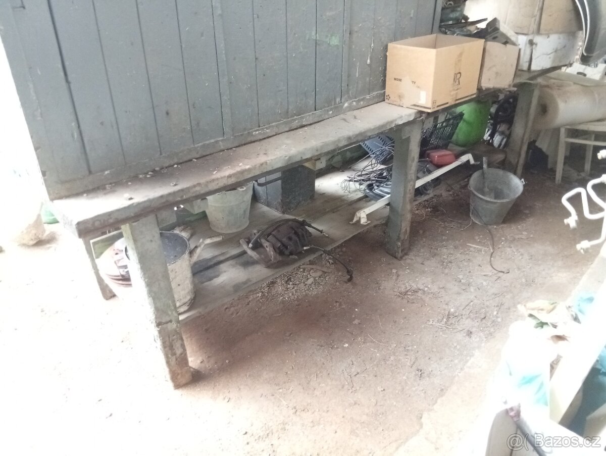Prodám velký dřevěný ponk, velikost desky je 296x94cm. Je pokryta plechem. Slušný stav, na fotce je to ten dolní