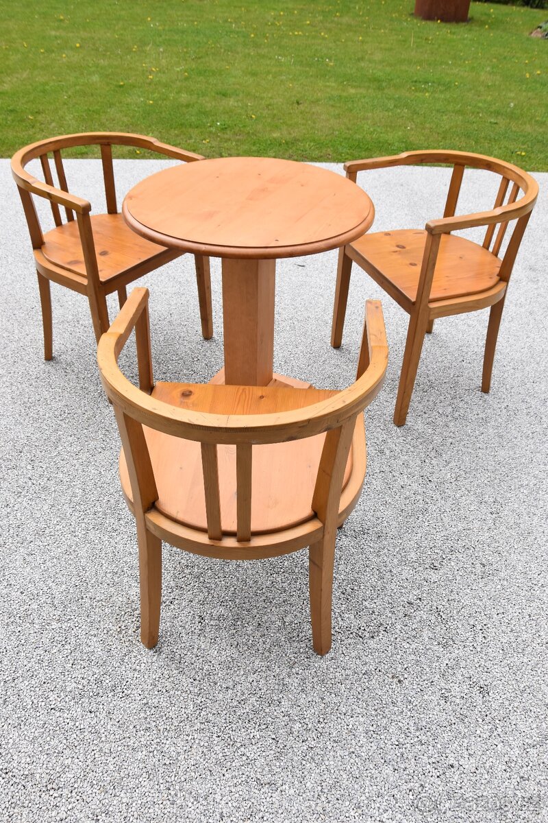 NABÍZÍM DŘEVENÝ KULATÝ STŮL SE TŘEMI KŘESÍLKY, VELMI ZACHOVALÝ STAV, KŘESÍLKA REPASOVANÁ, STŮL REPLIKA, POHODLNÉ SEZENÍ, ROZMĚRY KŘESÍLKA VÝŠKA 76 CM, ŠÍŘKA 56 CM, HLOUBKA 49,5 CM, KULATÝ STŮL PRŮMĚR 70 CM, VÝŠKA 77 CM