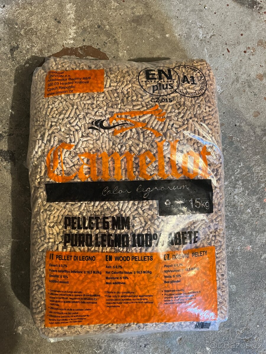Prodám 30 pytlů smrkových pelet A1 6mm. Hmotnost: 15kg/pytel.