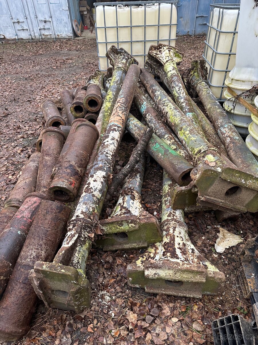 Prodám litinové sloupy viz foto. 13 kusů. 12 kusů sloupu má délku +- 270 cm. 1 sloup je kratší, cca 130 cm.