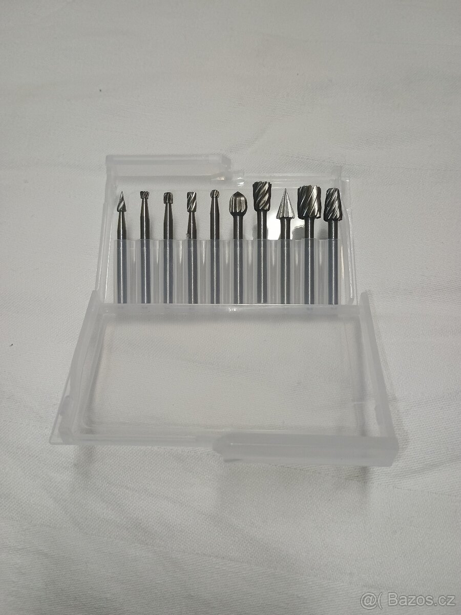 Prodám 10 dílnou sadu stopových frézek o průměru stopky 3mm z tvrdokovu wolframové slitiny. Vhodné pro gravírování,broušení řezbářství. Vhodné pro obrábění kovů,dřeva, plastů m, odstranění otřepů po řezání atd. Odzkoušené na ocelové pásnicí viz foto.Cena 90Kč je za celou sadu.