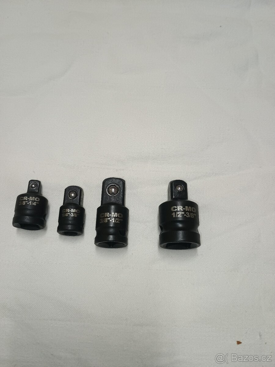 Prodám novou sadu 4 adaptérů pro rázové hlavice viz foto.velikosti 3/8-1/4. 1/4-3/8. 3/8-1/2. 1/2-3/8 Cena 140 Kč je za celou sadu.