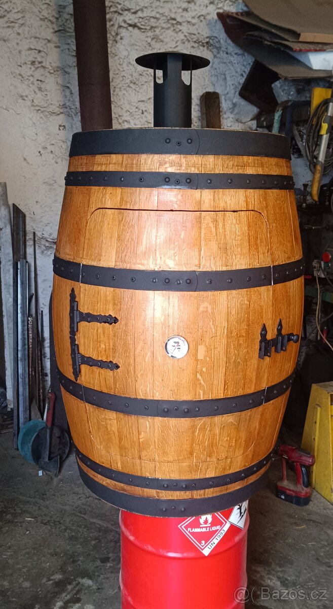 Prodám originální Sudovou udirnu vyrobenou z dubového sudu který byl plněn vínem (whisky) a pojme až 20kg masa. Včetně odkapávacího tácu, teploměru a 10ks nerez. háčků. Uvnitř je dvoupatrová stromeček s možností nastavení výšky.