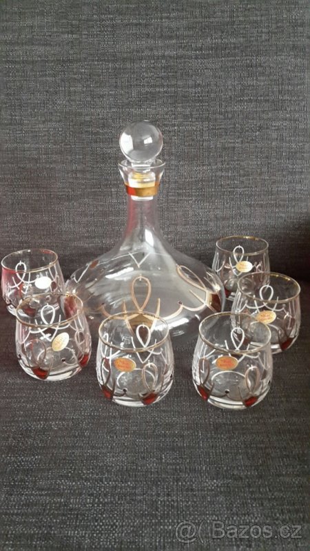 6 skleniček a karafa na brandy české výroby - Holub Maskl Bohemia. Nepoužitá sada, úplně nová včetně originální dárkové krabice.
