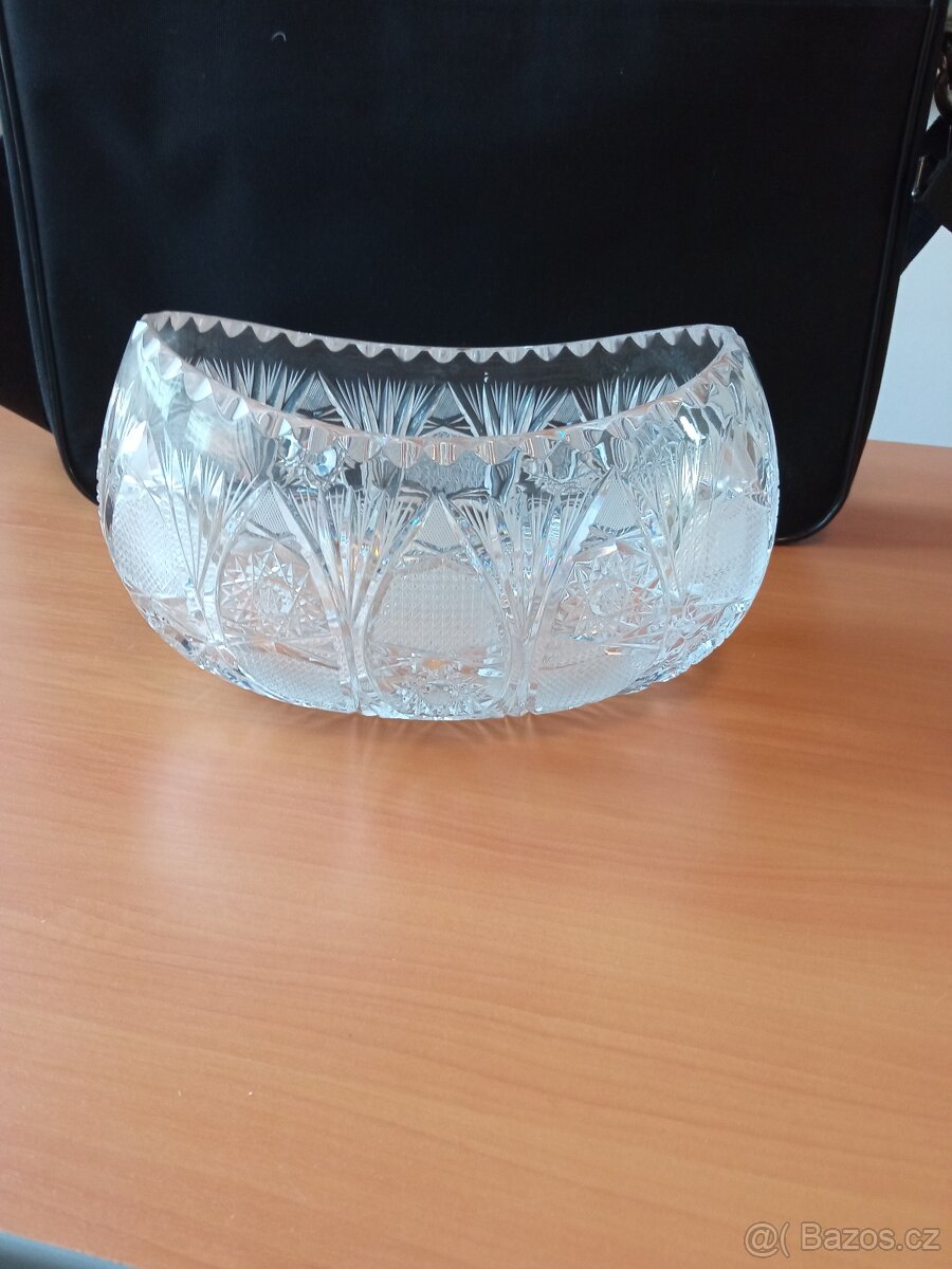 Kvalitní těžké sklo, dekorativní vzor – hvězdy, vějíře, geometrické prvky.