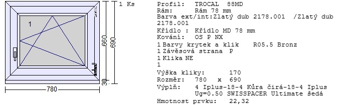 Okno 780 x 660+30mm barva zlatý dub/zlatý dub a sklo je matné - kůra