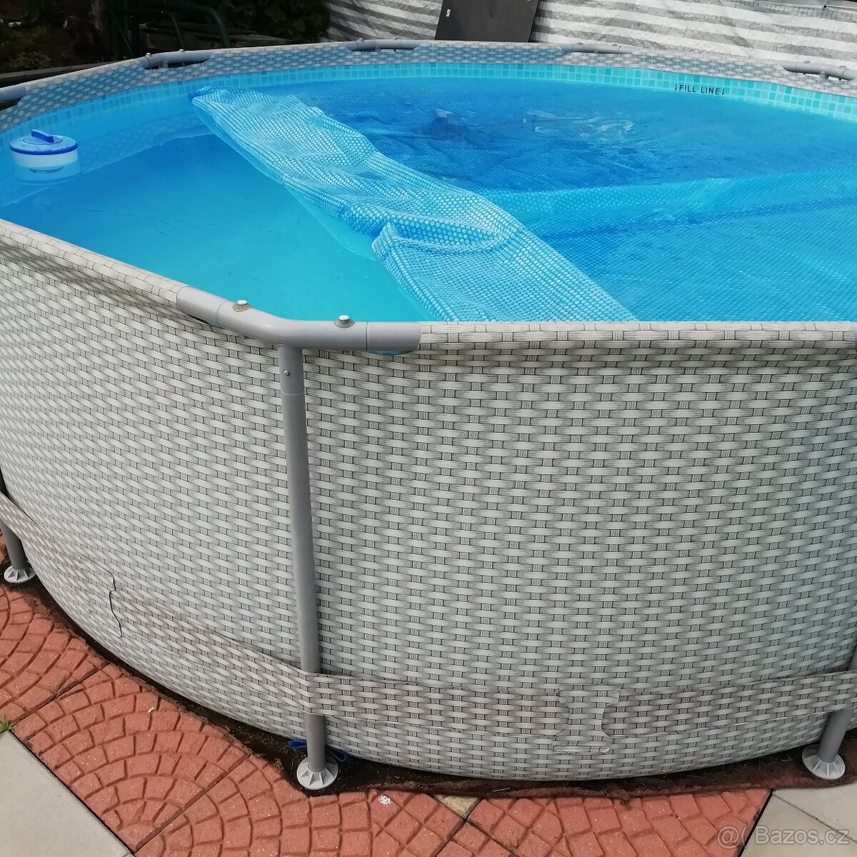 Prodám bazén konstrukce používaný dvě sezony, nepoškozený, součástí prodeje písková filtrace, schůdky, solární plachta, plovák, síťka, vanička, hadice 1" 12m.