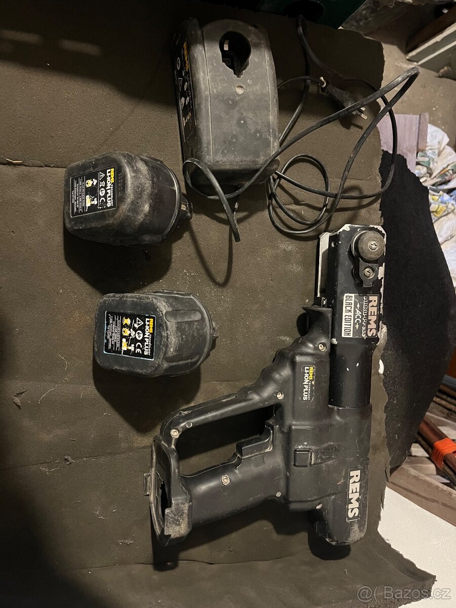 Prodám aku lis Rems s otočnou hlavicí, 2 x baterie včetně nabíječky + 5x čelist V - 15/18/22/28/35 a 1x čelist TH 26