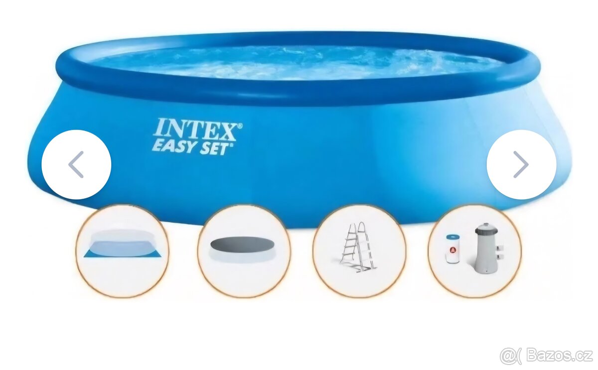 Prodam 4 mesice stary, 2 mesice pouzivany nafukovací bazén INTEX Easy Set 4,57 × 1,07 m se sadou příslušenství- tj filtrace, schudky, zakryvaci plachta. Umyty a sbaleny v original krabici.jen napustit. pigmentove skvrny na dne bazenu od chloru - esteticka zalezitost. Zadne vady, plne funkcni. Da se rici novy PC 5038,-Kc koupeno cerven 2025, fakturu dodam