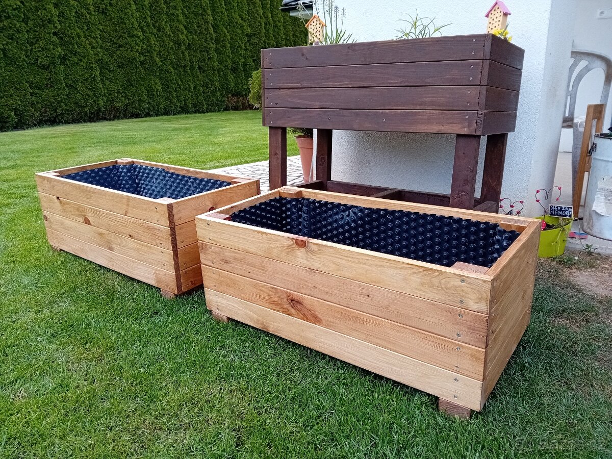 Prodám zahradní truhlíky z masivu borovice. Rozměry 77x39x33. Vše je šroubované. Základní bez nátěru 900 Kč.Vyvýšený 1400 Kč. Velice pevný. Poctivá práce. Nátěr dle vašeho požadavku + 200 Kč