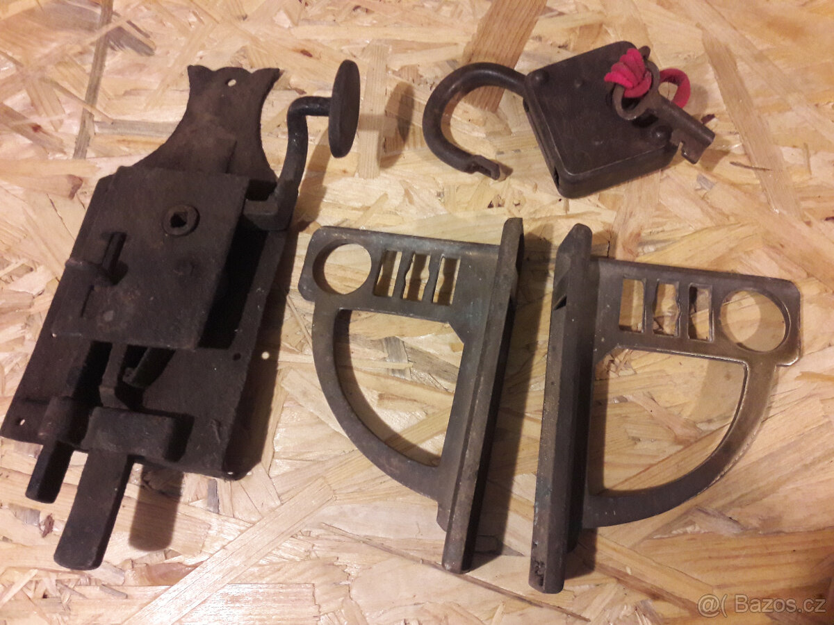 historické zámky dveřní+visací a mosazné konzoly na garnyž. V původním stavu, funkční a nečištěné.