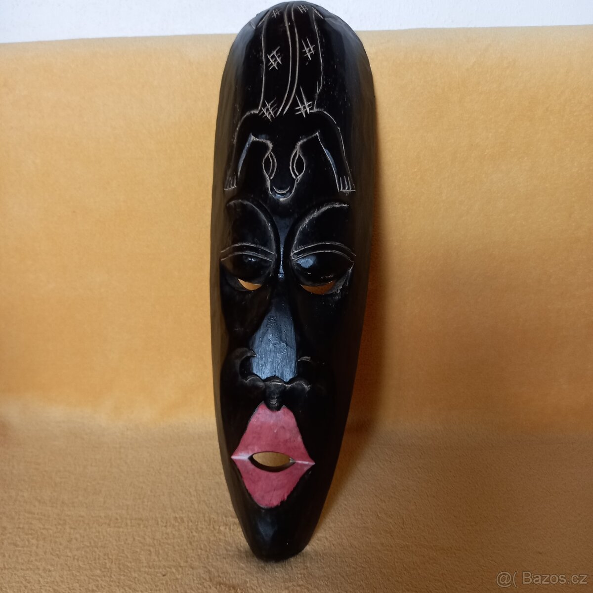 Vyřezávaná dřevěná maska z Indonésie z lehkého dřeva k zavěšení na stěnu, rozměry 50 x 15 cm. Již několik let stará výhra z tomboly (má štítek z Dekorativního zboží).
