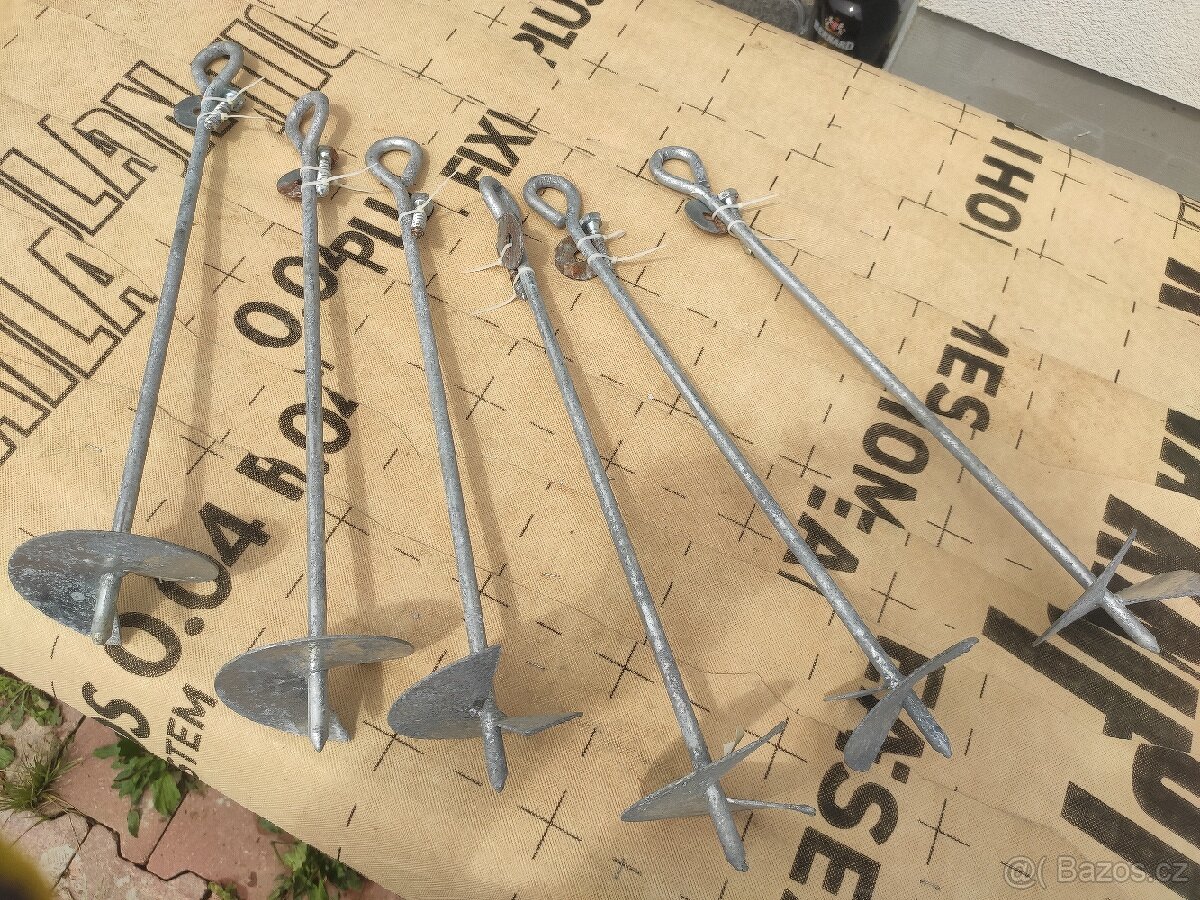 Prodám 6ks zemních kotev vč. Šroubů, viz. Foto. Zemní kotva se zavrtává do země a slouží k ukotvení herních sestav nebo přídavných modulů dětských hřišť, k zajištění stability a bezpečí herních prvků. 10x500mm