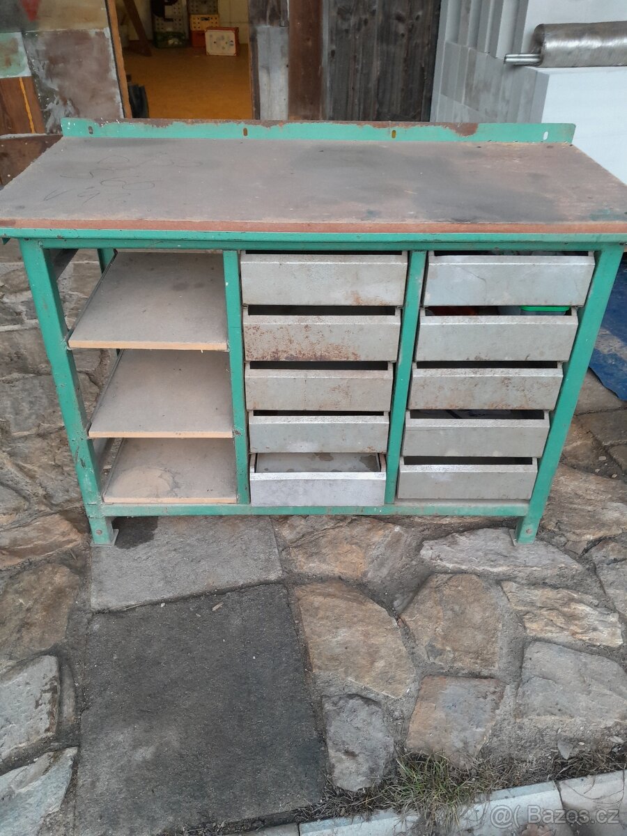Pracovní , dílenský stůl ,ponk se skříňkou - [19.2. 2026]Nutný vlastní odvoz, těžký kovový. Skříňka má zámek , bez pracovní desky. Pište sms