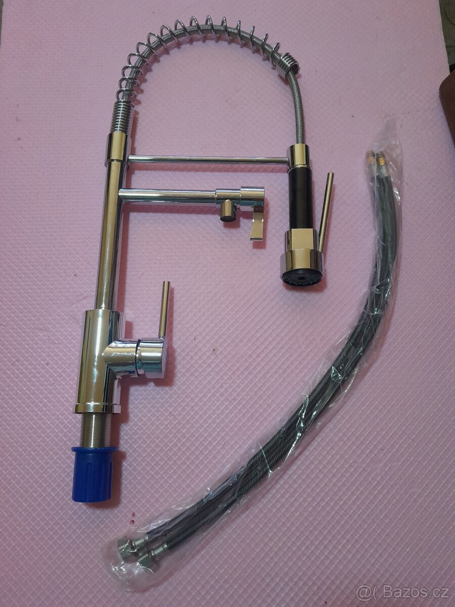 Nabízím novou kompletní dřezovou stojánkovou baterii s ruční vypínací sprškou. Celková výška 50cm, vzdálenost do ramene do dřezu 22cm.