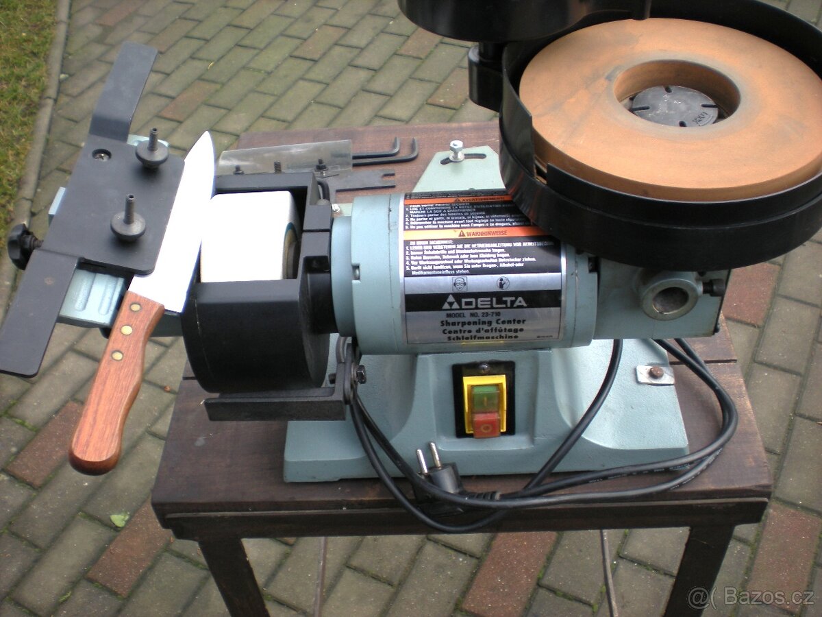 Nabízím málo používanou brusku Delta- ostřící centrum je specializované stolní zařízení určené pro přesné broušení a ostření různých řezných nástrojů. Zařízení disponuje suchým brusným kotoučem pro rychlý úběr materiálu a pomaloběžným mokrým kamenem pro finální ostření bez rizika spálení ostří (voda chladí). Obsahuje nastavitelné podpěry nástrojů pro udržení přesného úhlu broušení. Je ideální pro ostření dlát, nožů, hoblovacích nožů, nůžek a jiných řezných nástrojů. Pevná litinová konstrukce minimalizuje vibrace.