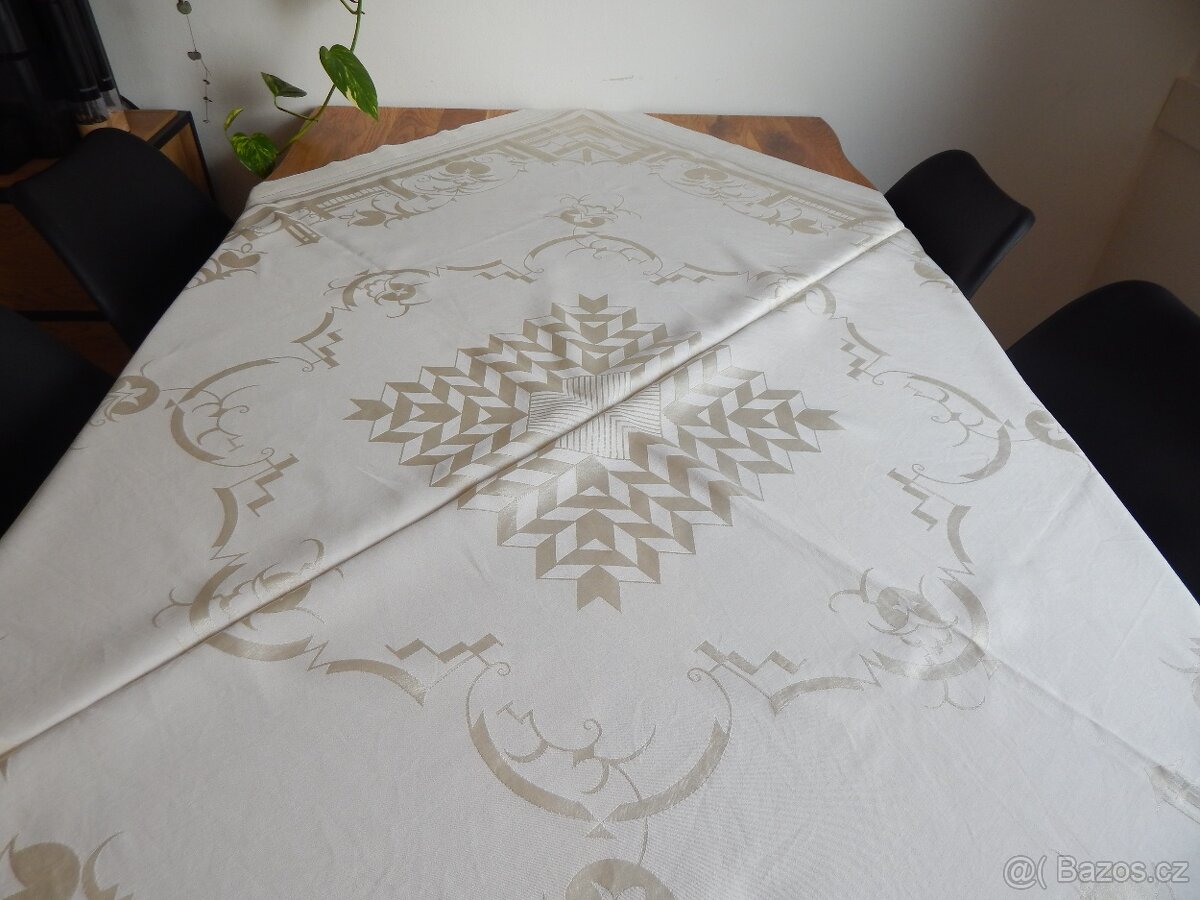 Nabízím, po přestěhování nevyužiji. Muž přinesl do výbavy, ani jsem ho nepoužívala, SUPROVÁ KVALITA, NÁDHERNÁ VÝŠIVKA - dnes by nikdo nedělal. Rozměry 155 x 157 cm. Nádherná smetanová barva s motivy dozlatova ... + poštovné ZAS. BAL.
