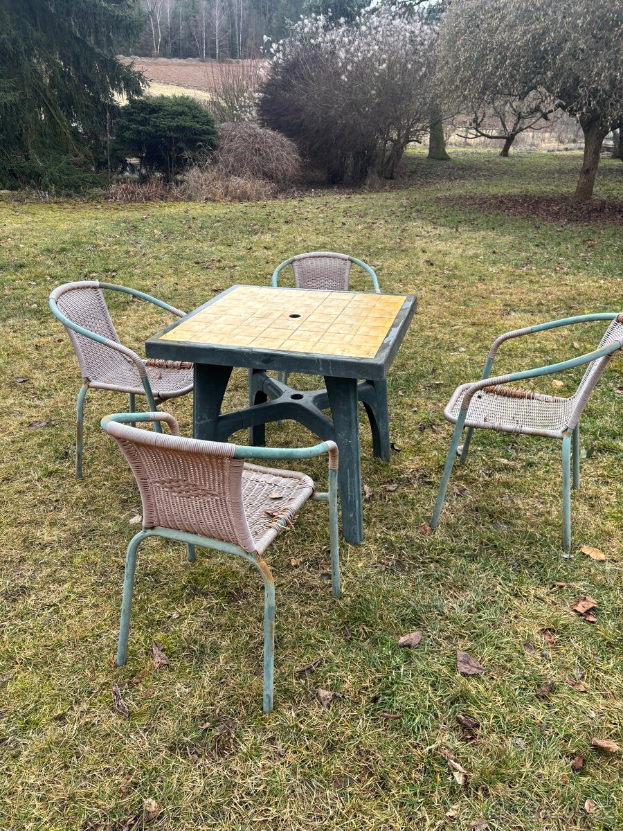 Zahradní set – stůl (cca 80 × 80 cm) + 4 židle. Stav viz foto – používané, místy oděrky a opotřebení, ale stále funkční. Za odvoz, Drásov.