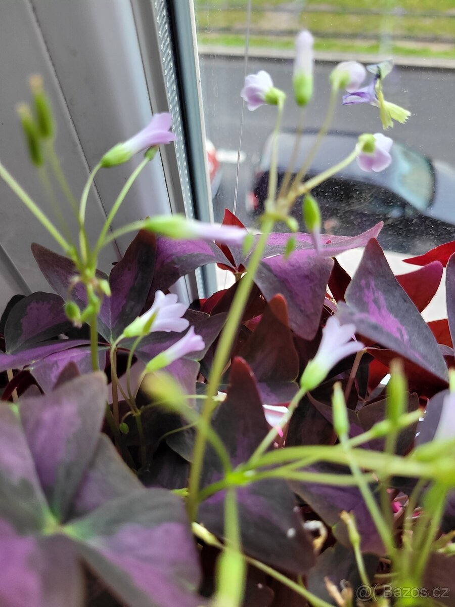 Nabízím pokojovou květinu s červemými trojlístky, která kvete drobnými kvítky. Cena 65kč