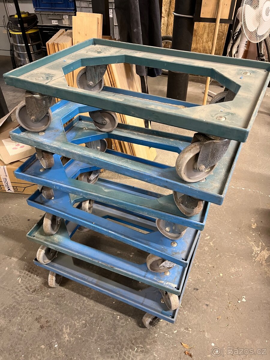Prodám vozíky pod přepravky 60x40cm na velkých bytelných kolečkách. Nosnost 250kg.