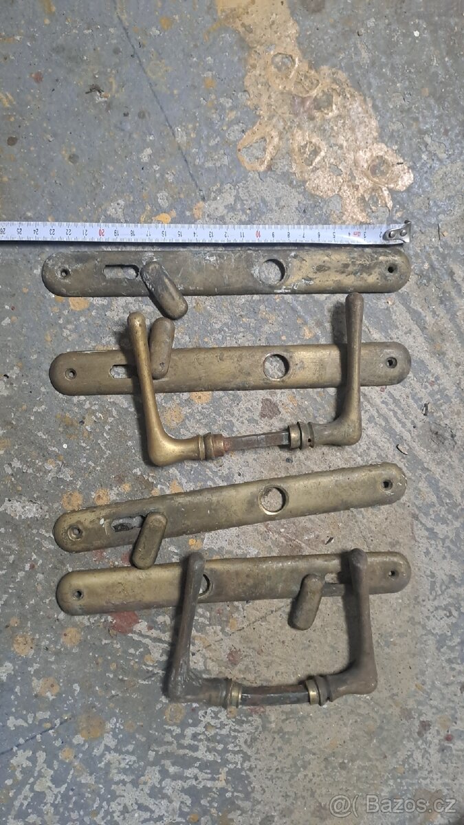 Staré mosazné kování. - [23.2. 2026]Dveřní staré mosazné kování, štítky a kliky. Stav viz foto. Rozteč stejná 9 cm. Cena za jednu sadu.