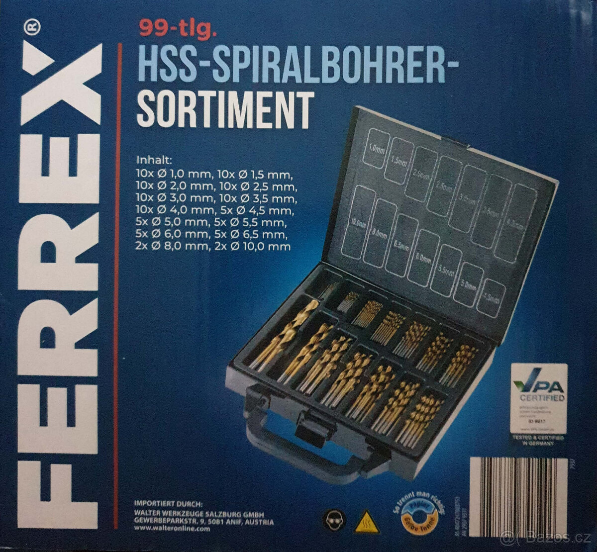 Vrtáky set kufr kovový 99ks,vys.kvalita, HSS-spirála Titannitrid, pr.1-10mm, PROFI provedení, nepoužité, profi kvalita- rakouský výrobce - není china, 2 roky záruka