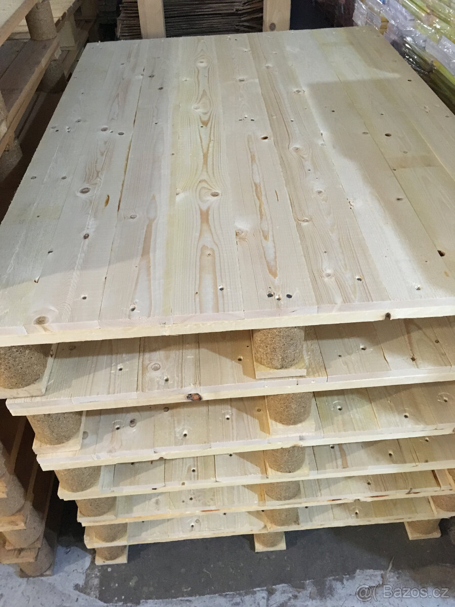 Prodám dřevěné palety, 88x120 cm, výška 14 cm. Plná plocha, čisté dřevo, hoblovaná horní strana.