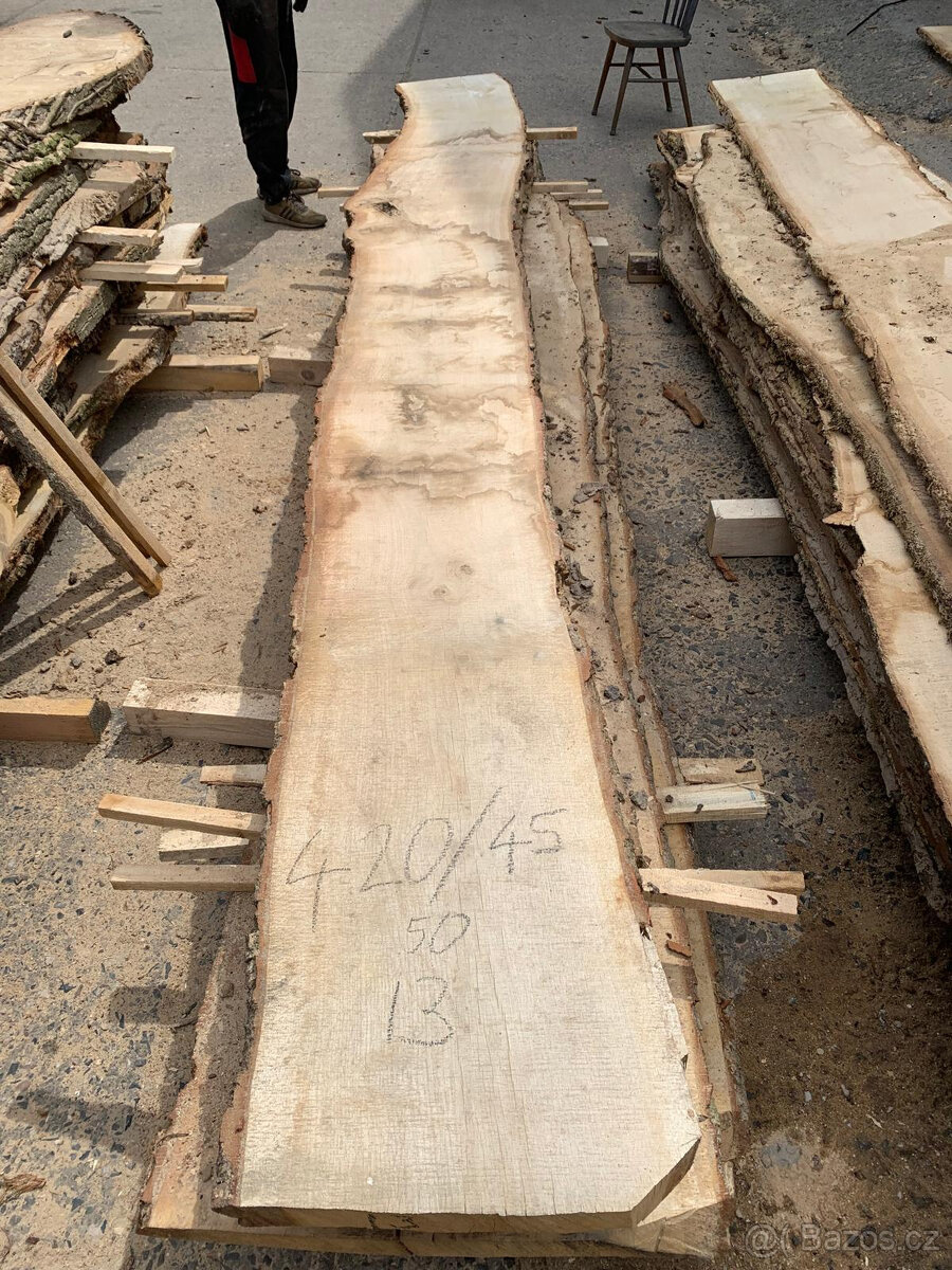 Prodám celkem 26 fošen dubu viz foto. Káceno podzim 24. Délka 4200x50 šíře od 400 do 620