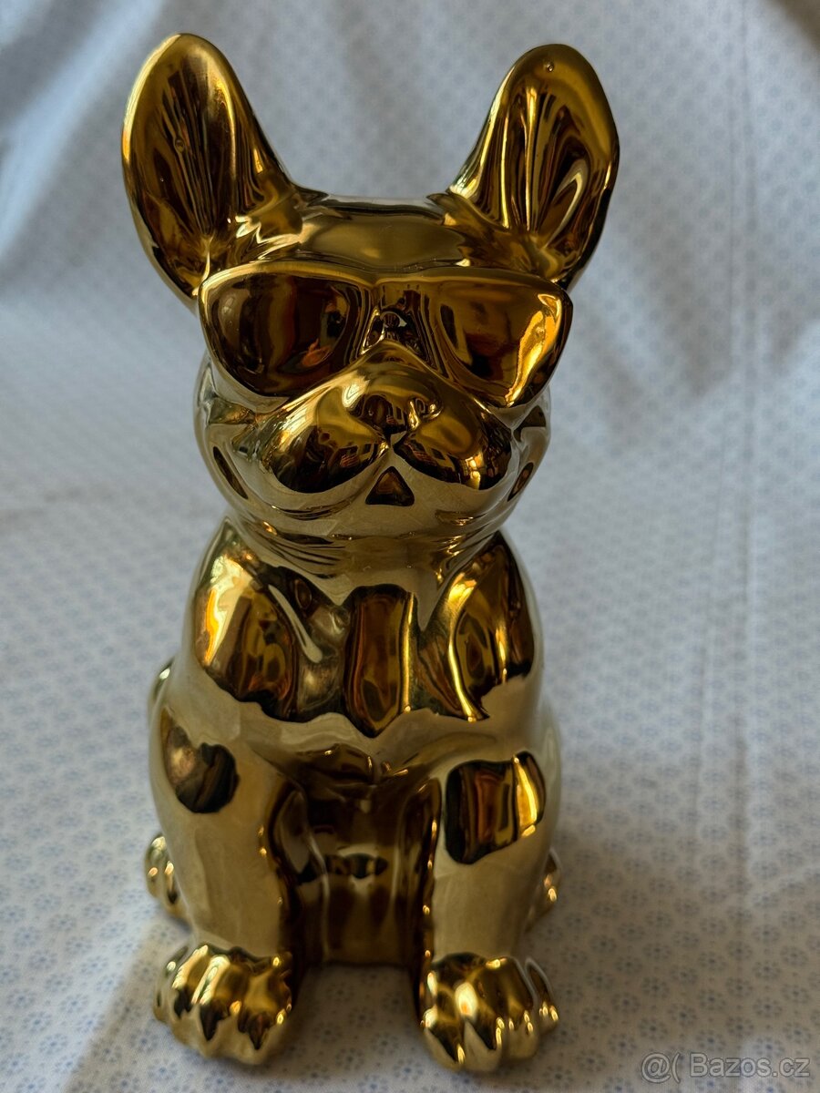 Prodám pop artovou “zlatou” pokladničku buldok v brýlích a k tomu vázu ve stejném duchu. Pokladnička má cca 15cm, váza cca 20cm.
