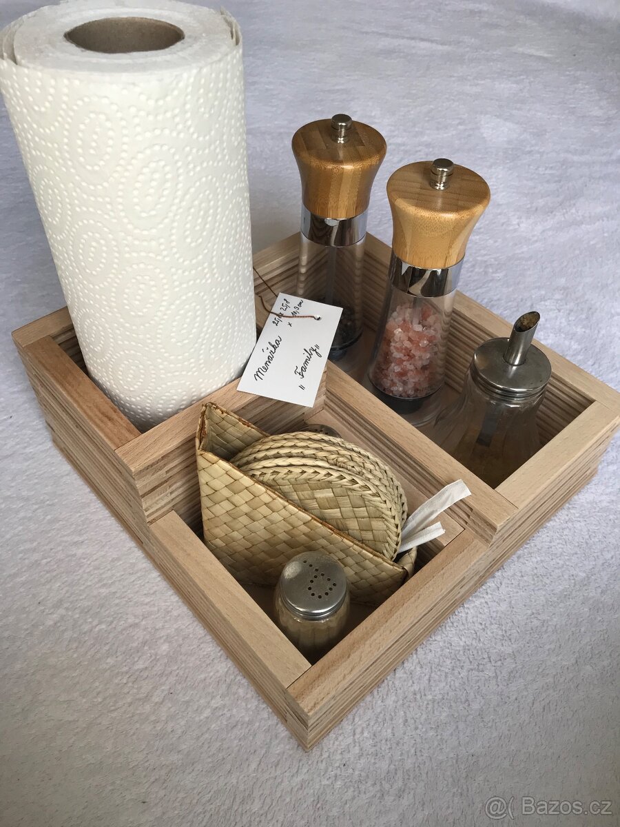 Prodam menazku tac podnos z bukoveho dreva, podstava z preklizky. Rozmery 25,8 x 25,8x 5,2cm/7,5cm/10,2cm. Bez povrchove upravy, lze nalakovat vodou reditelnym lakem za poplatek 40,-Kc. Vlozene veci nejsou soucasti ceny. Pekne vypada i vaza misto papirove rolky. Lze zaslat pres balikovnu nebo zasilkovnu.