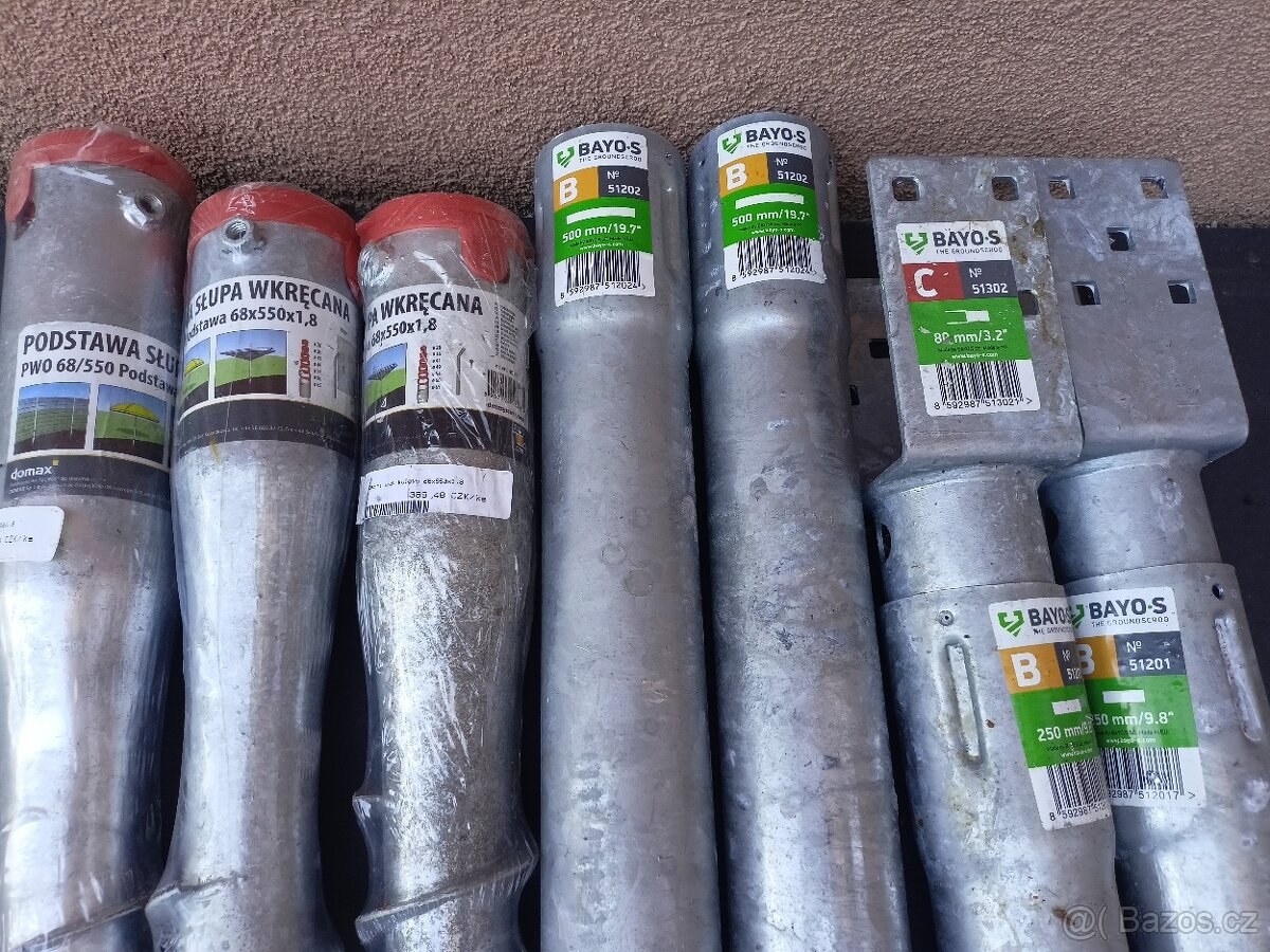 Kovové zakládací patky / zemní vruty - [2.1. 2026]Prodám velmi robustní zakládací patky / alterantiva zemních vrutů. vkládají se do děr vyvrtaných zemním vrtákem. Průměr patky 160mm. délka 90cm, sloupek trubka 80x3. 9ks. Cena dohodou.