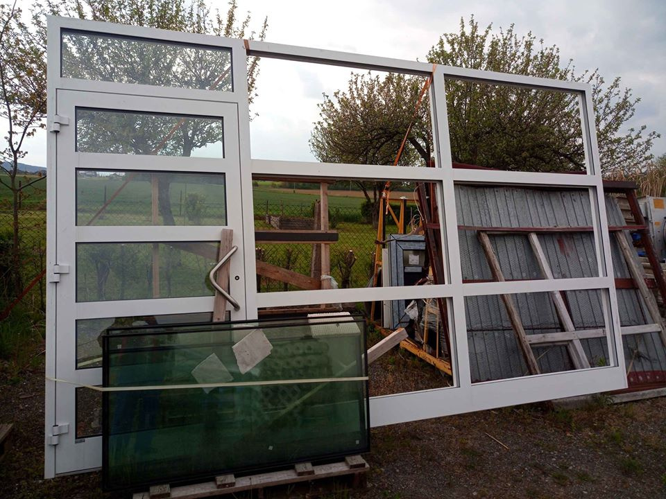 Celohliníková prosklená stěna rozměry: v = 245 x š 396 x tloušťka 8,5 cm, dveře v = 201 x 98 cm, skla tloušťka 3,5 cm lepená s bezpečnostní fólii ze 4 ks skel, z děleného hliníkového profilu odizolovaná izolační vrstvou, aby nedocházelo k tepelnému mostu. Izolační dvojsklo. Komplet jak je na fotkách i s kováním. Je uloženo na expediční paletě, kterou Vám naložím VZV. Stěna byla nainstalována a po týdnu nahrazena velkým proskleným vjezdem do autosalónu. Nová stála 180000,- Kč.