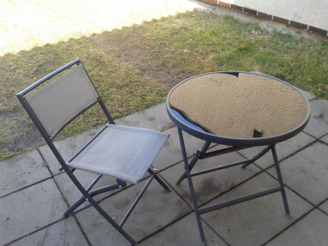 Prodám nepoužívaný zahradní stolek s jednou židlí kov barva šedá viz obrázek za 1100,-Kč