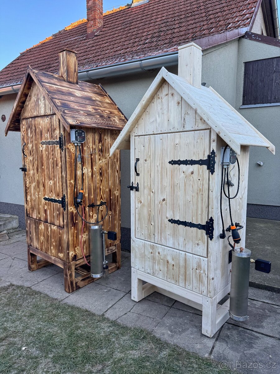 Dřevěná udírna ze smrkových palubek (19 mm), konstrukce z hranolů 6×4 cm.