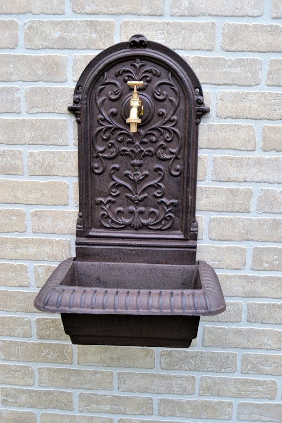 Krásné litinové zahradní umyvadlo, kašna s mosazným kohoutkem.