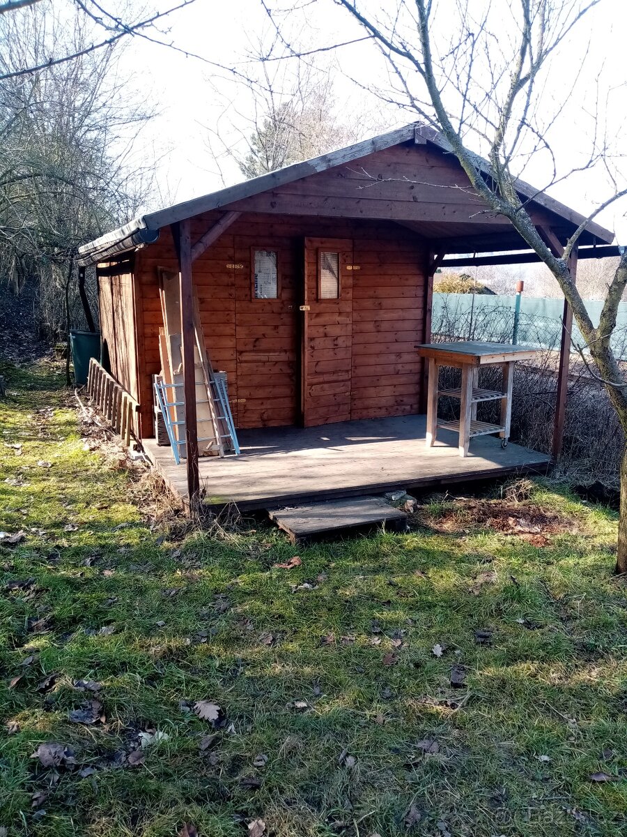 Zahradní domek s terasou. Rozměry 5,3m x 3,3m, výška 2,3 m, chata 3x3 m, terasa 2x3 m.