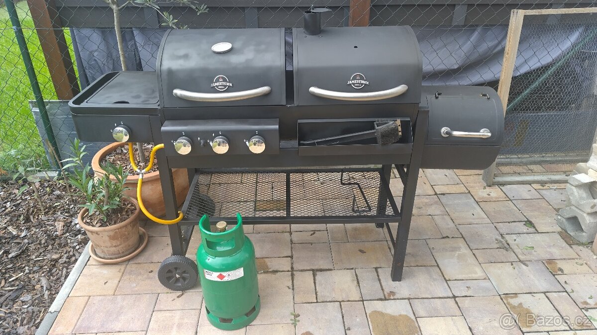 Prodám málo používaný kombinovaný gril Jamestown Dean za 5 999 Kč (bez plynové láhve). Původní cena 11 000 Kč. Gril se skládá z plynové plotýnky, plynového grilu (3 hořáky), grilu na dřevěné uhlí či brikety a udírny. Ke grilu je také ochranný obal. Více viz foto a odkaz: https://www.obi.cz/kombinovane-grily/jamestown-kombinovany-gril-dean-116-x-173-5-x-61-cm/p/5384961. K vyzvednutí v Praze 9 (Hostavice). Preferuji e-mail/SMS.