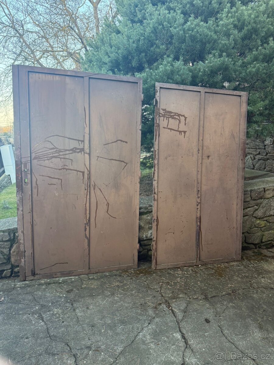 Prodám bytelná plechová garážová vrata, zateplená polystyrenem, bez rámu. Rozměr vrat: výška 201 cm, šířka - 230 cm (2x115 cm). Zajištění křídla (bez zámku) rozpěrou spodní/horní čep.
