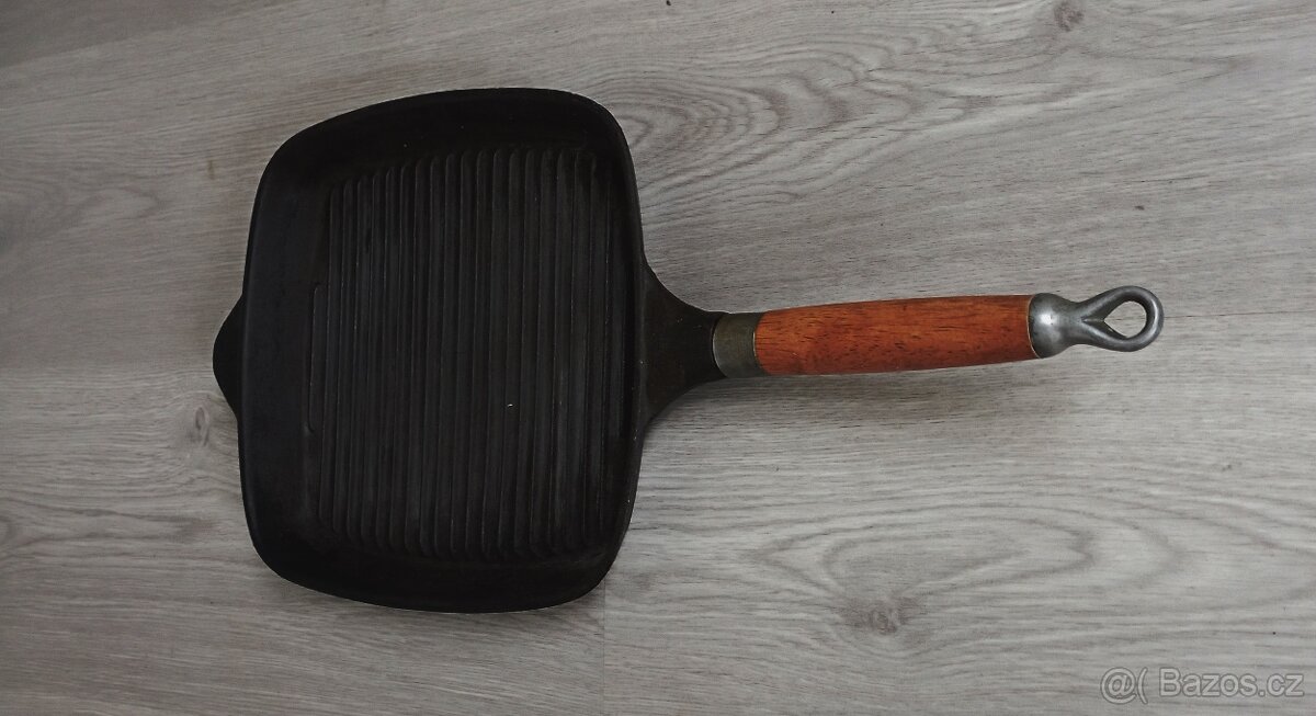 Dvě těžké litinové pánve, hranatá rozměry 24 x 24 cm, celková délka s dřevěnou rukojetí 47 cm, s drážkami uvnitř a se smaltovanou spodní plochou a kulatá, průměr 28 cm, celková délka s dřevěnou rukojetí 54 cm. Obě vhodné i ke grilu na otevřený oheň, nezničitelné, výborný stav. Cena za kus 500 Kč, při odběru obou 800 Kč celkem.