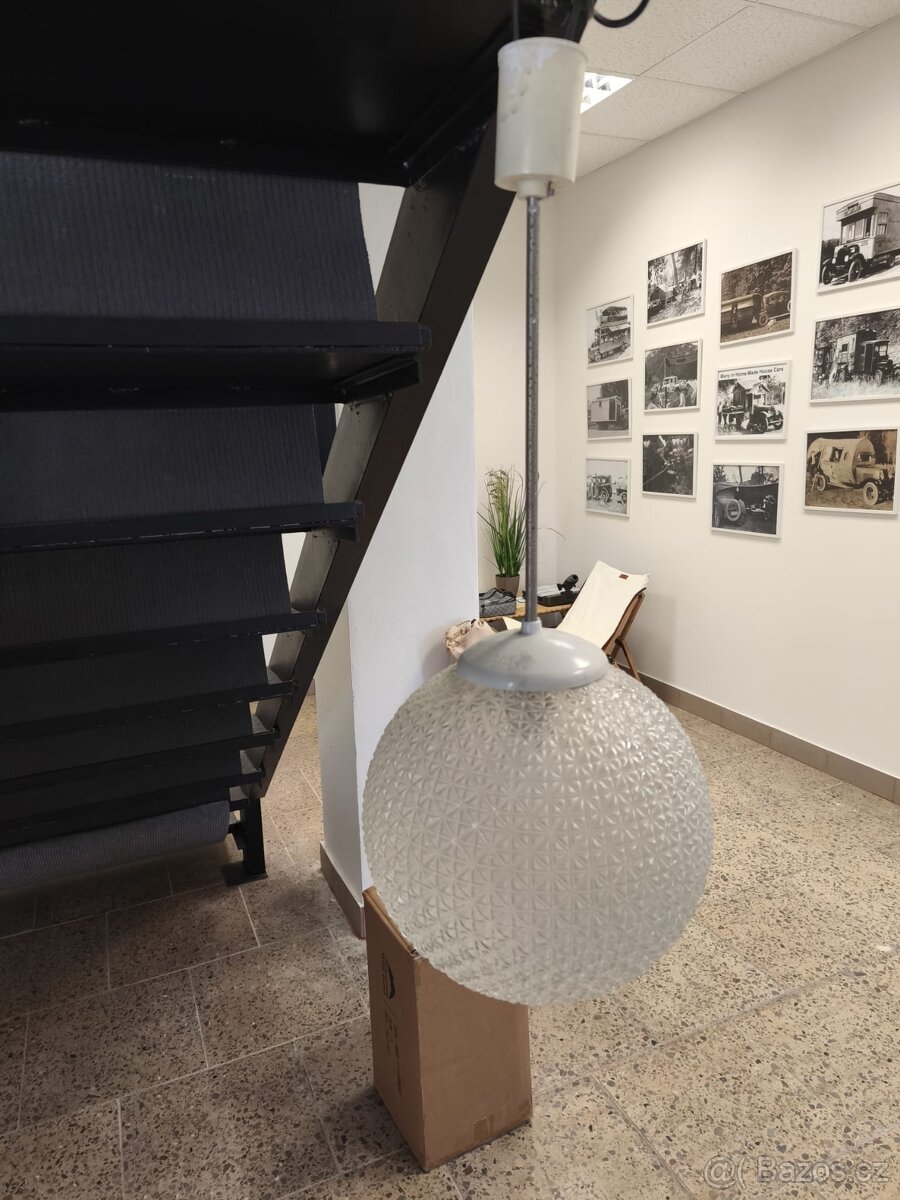 Prodám retro lustr koule, celková délka 70cm, možnost zkrácení tyčky, koule skleněná, průměr 30cm, k dispozici celkem 15 kusů. Prodej možný i po jednotlivých kusech.