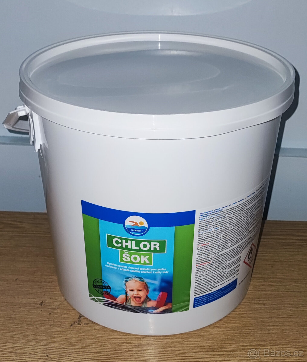 Prodám rychlorozpustný chlorový granulát chlor šok, pro rychlou dezinfekci v případě zezelenání nebo náhlého zhoršení kvality vody v bazénu. Nový, nerozbalený. Datum spotřeby 9.12.2028. Balení 10 kg. Vyrobeno v ČR. Původní cena 1514,- Kč. Nyní je cena při osobním odběr v Solnici 1190,- Kč nebo možno zaslat kurýrem s platbou předem převodem za 1329,- Kč nebo zaslat s platbou v hotovosti kurýrovi za 1398,- Kč. Cena je pevná. Inzerát platí do smazání. V případě zájmu je NUTNÉ VOLAT PŘEDEM. Na e-mail nereaguji.