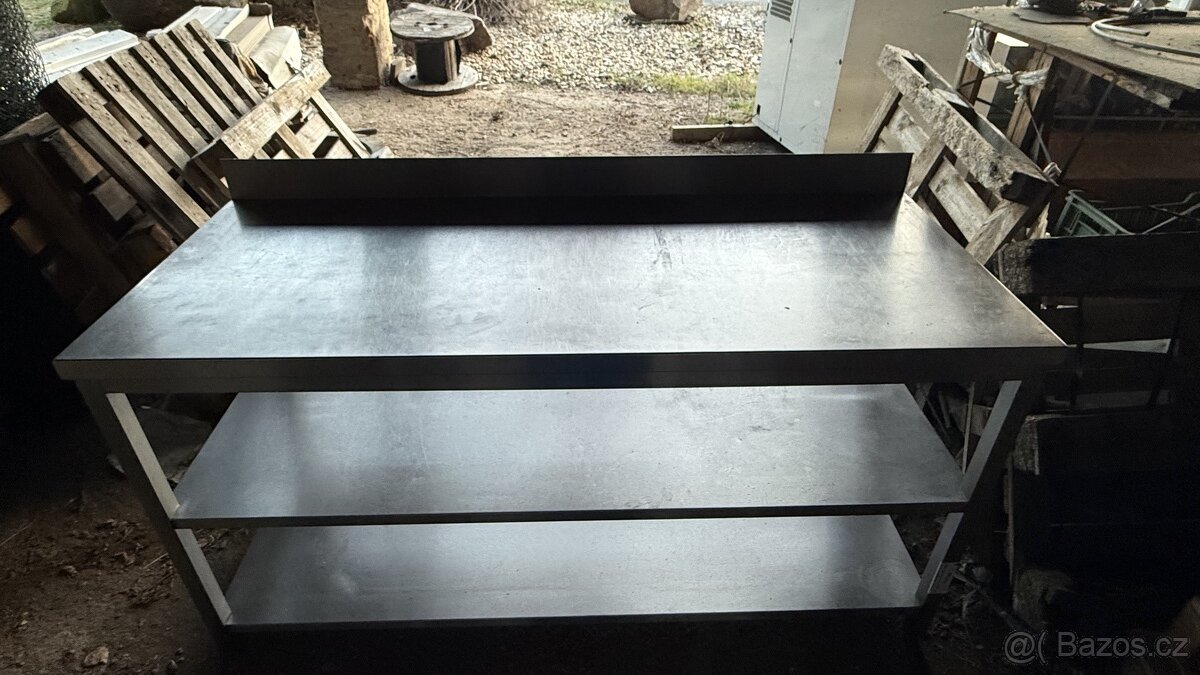 prodam nerezovy stul s jednou polici, rozmer dle foto, pevna konstrukce, vhodne u jako ponk, vice info na tel.