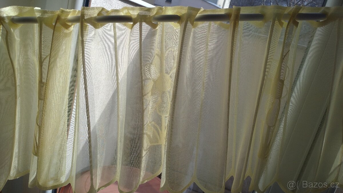 Prodám žluté silonové, krátké záclonky s květy, spodní okraj vlnky, vhodné do kuchyně a nebo na chatu do menších oken navléknout na tyčku. Dírky na horním okraji jsou zpevněné, velikost 3 x 1 cm. Výška záclonky: 37 cm (od spodního okraje k hornímu), šířka první je 93 cm, druhé 101 cm a třetí 228 cm (je nastavená, sešitá - viz foto). Předám osobně v Praze.