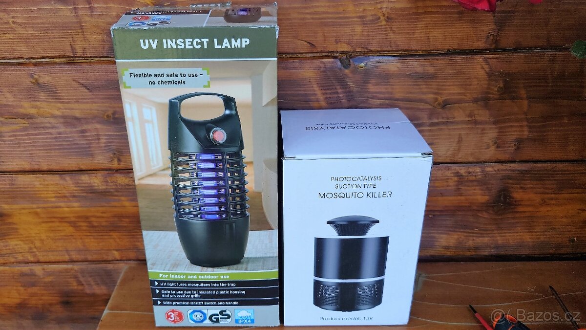UV insekt lampa je na batérie,takže vhodná např.do stanu,nebo kde není přístup k elektrické síti.Mosquito killer je na připojení k USB.Oba přístroje lákají hmyz modrým světlem.Lampa zabíjí el.výbojem a mosquito Funguje na principu nalákání hmyzu na světlo, dvě automaticky pravidelně měněné frekvence záření. Komáři jsou poté skrz mřížku násáni tichým větrákem do sběrné nádoby a proud vzduchu jim znemožňuje vylétenout. Ráno se jen vysype košík.cena za menší 150 Kč,za větší 250Kč