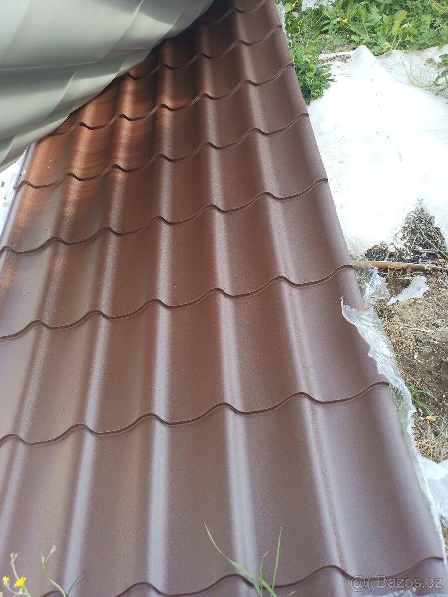 Prodám hnědý taškoplech, výrobce Satjam hnědý Ral 8017 Kingas eco plus . Úplně nový, zákazník se přál jiný odstín. Plechů je celkem 19ks, délka je 530cm, šířka plechů je 120 cm. Cena