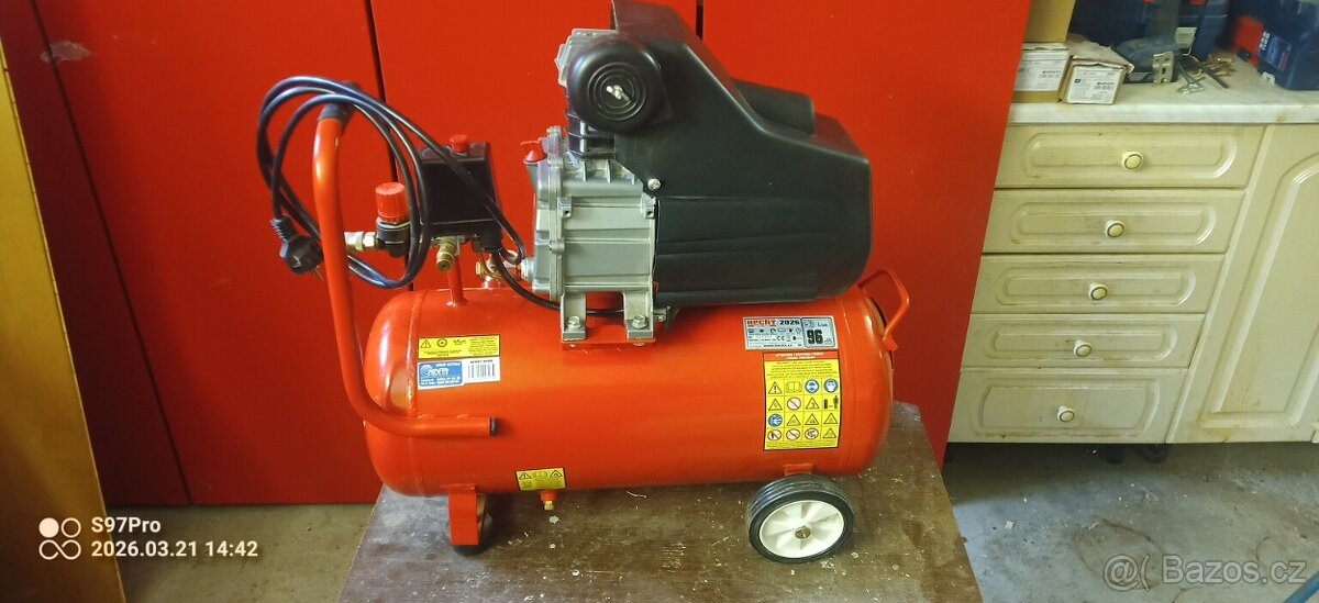Prodám olejový kompresor HECHT 2026, objem 24 l, příkon 1,5 kW, max. tlak 8 bar, ot. motoru 2850/min, sací výkon 184 l/min, hmotnost 20,6 kg, 230V. Výroba 2021, koupeno 05/2022. Funkční