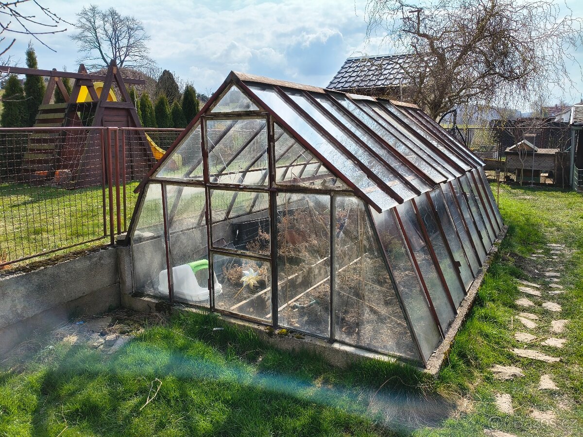 Klasický skleník, železná konstrukce se sklem, dvě větrací okna. Z jedné strany nutno podezdít (viz.foto). Rozměry 4,6 m délka, šířka 2,8 m, výška 1,8 m. Nutná vlastní demontáž a odvoz. České Budějovice