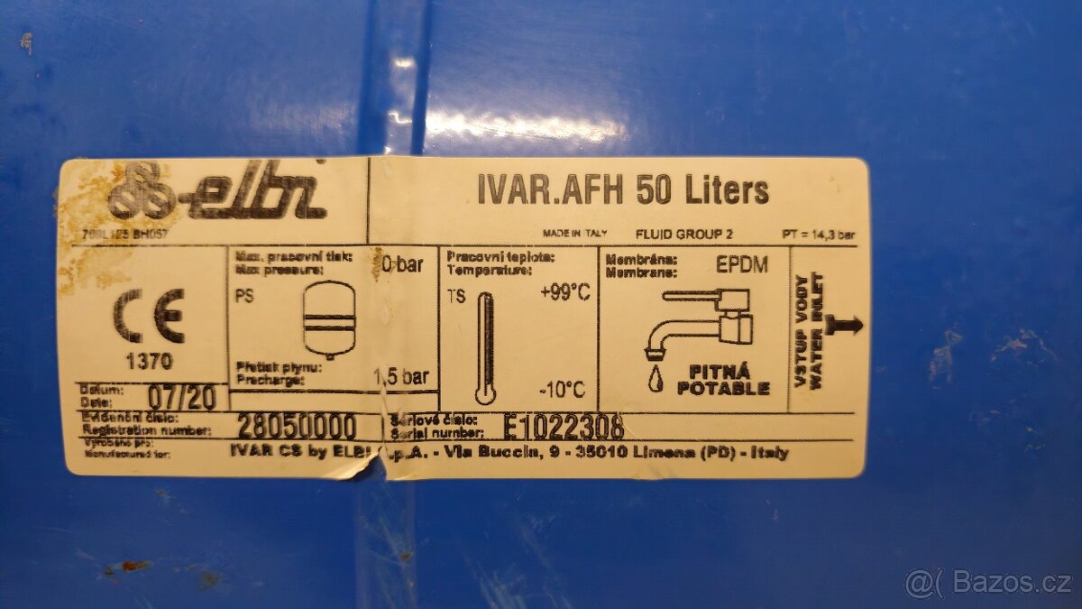 Prodám ležatou tlakovou nádobu na vodu s vyměnitelným pryžovým vakem italského výrobce "Elbi" typ Aquatrading 50l, 10bar.