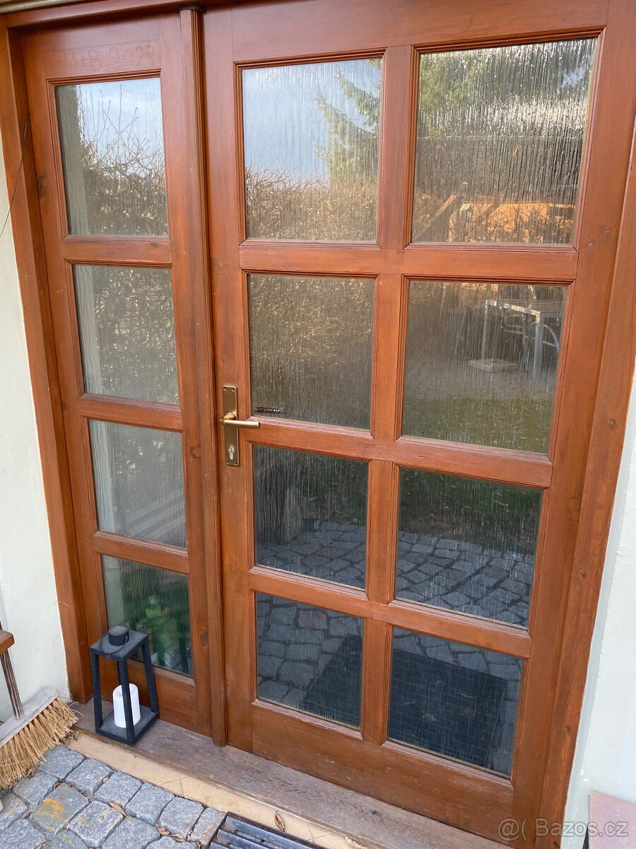 Prodám vstupní dvoudílné levé dveře z masivu s izolačním dvojsklem - čirá kůra, povrchová úprava xyladecor a oversol v barvě pinie. Dveře jsou používané, ale pevné a plně funkční, rozměr dveří 146x199 cm, rozměr současného otvoru pro dveře je 158x204 cm. Dveře budou bez rámu. Dveře k dispozici na začátku července 2026.